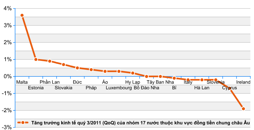 So với quý 2/2011, GDP eurozone tăng trưởng 0,2% trong quý 3/2011. Tăng trưởng GDP quý 3/2011 tại 2 nền kinh tế lớn nhất châu Âu bao gồm Đức và Pháp giúp bù lại cho nhóm nền kinh tế yếu trong khu vực. Nhiều chuyên gia dự báo khả năng kinh tế eurozone suy thoái nhẹ trong năm 2012 lên tới 40%.